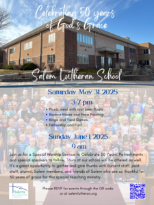 Salem Lutheran School Celebrates 50 Years! By Jess Herbst Friday, May 9, 2025 • 1 min read Posted in School News Please join us on May 31st and June 1st to celebrate 50 years of God’s grace and guidance for our school!